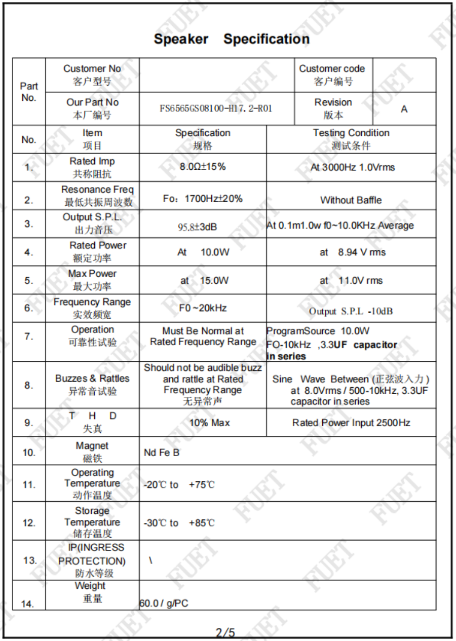 最低共振周波數(shù) | 1700Hz±20% | Without Baffle |